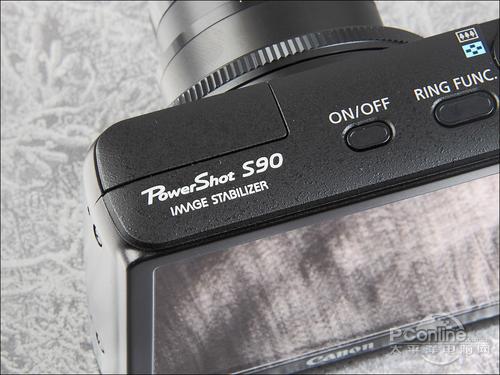 这次的佳能S90外观设计同样十分简洁,整体显非常平整的方块设计,机身顶部除了模式转盘、电源开关与快门变焦杆之外,还设置了一个功能切换按钮,用以切换镜头控制环对应的功能。