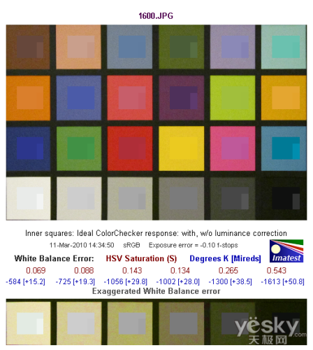 白平衡偏移方面,曝光值误差在-0.10,白平衡基本没有偏移,非常准确,ISO 1600时的偏移比较小,最高处为0.543,色温偏移数值为-1613,白平衡偏暖。