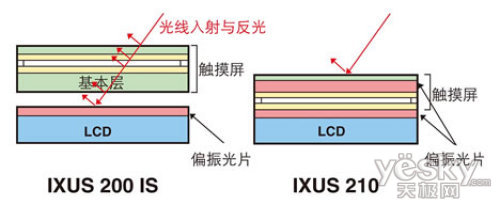 佳能IXUS 210是佳能第一款采用分辨率高达46.1万点的3.5"宽屏(16:9)数码相机。相比IXUS 200 IS机身背面取消了所有功能按键,而采用全触屏的方式,。另外与IXUS 200 IS触摸屏相比,IXUS 210不但具有“晶炫II”的高性能,同时更清晰更薄,它将触摸面板与液晶(偏振光片)粘合在一起而不留一点缝隙,由此实现了相机轻薄化,同时抑制了LCD的反射光,大大提高了可视性。