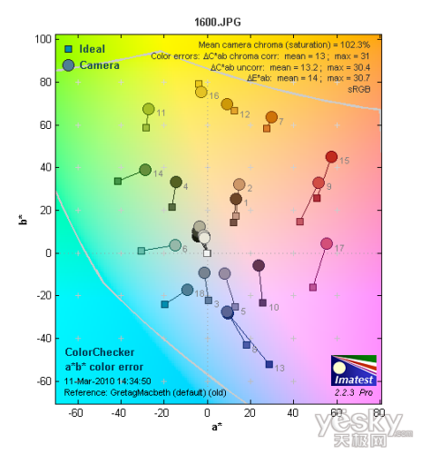 从ISO 1600时的色彩偏移的情况看,佳能IXUS 210的色彩饱和度为102.3%,最大偏移量为31。与ISO100时的情况基本一致,但各个色区域的偏移幅度都有所增大。