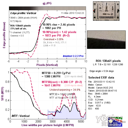 我们使用Imatest对佳能 IXUS 210的镜头分辨率与色散情况进行了测试,大家可以将测试所得的分辨率结果与上图标准进行比对,从而获得直观而明确的参考。