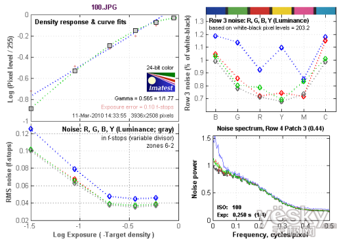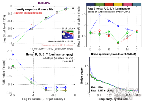 ISO 100的最高躁点值为0.12左右,属正常情况。从Row 3 noise:R,G,B,Y(Luminance)图表中可以看到,在蓝色上是以蓝色通道的噪点为最多,达到1.2左右。红色上是以蓝色通道的噪点为最多,达到0.9左右。绿色通道的噪点最高值亦出现在蓝色上,达到1.1左右。