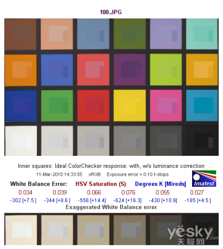 曝光偏移方面,曝光值误差在0.10,白平衡方面,ISO 100时的偏移非常好,最高处为0.076,色温偏移数值为-624,白平衡偏暖。