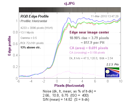 从边缘水平分辨率测试的结果看,分辨率达到了822LW/PH,低于好的水平,机内进行了一定的锐化,没有出现明显的驼峰现象。