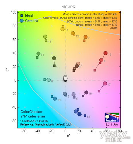 从ISO 100时的色彩偏移的情况看,佳能IXUS 210的色彩饱和度为109.4%,最大偏移量为13.5,各个颜色区域的偏差都很小。