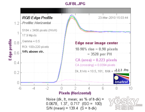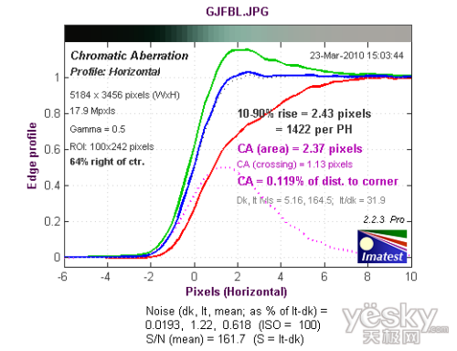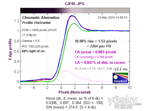 从长焦端边缘水平方向色散测试结果来看,色散区域为0.883像素,蓝色通道的色散高于其他三个通道。