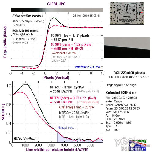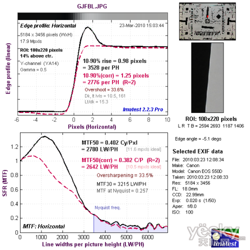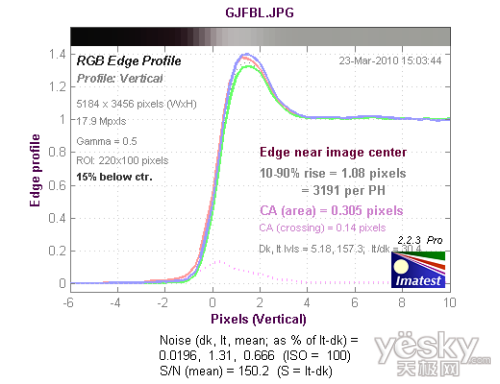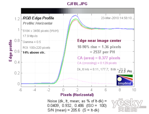 从边缘垂直分辨率测试的结果看,分辨率达到了2278LW/PH,达到优秀的水平,机内进行了一定的锐化,出现了驼峰现象。
