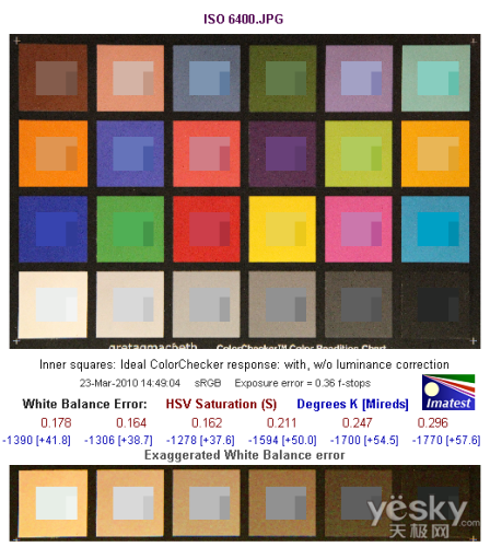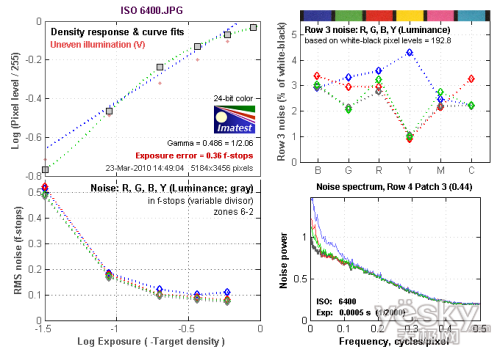 ISO 6400的最高躁点值为0.35左右,噪点控制的相当的好。从Row 3 noise:R,G,B,Y(Luminance)图表中可以看到,在蓝色上是以红色通道的噪点为最多,达到3.5左右。红色上是以蓝色通道的噪点为最多,达到3.7左右。绿色通道的噪点最高值亦出现在蓝色上,达到3.4左右。