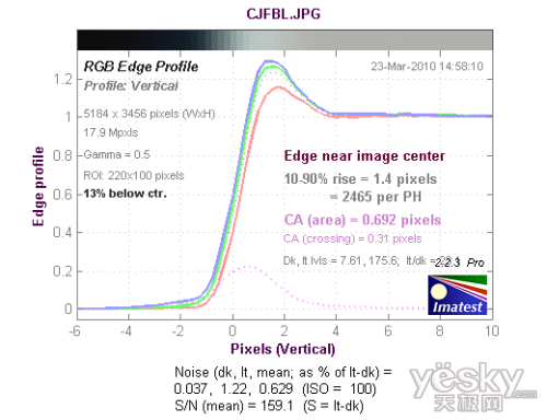 从边缘水平分辨率测试的结果看,分辨率达到了1598LW/PH,达到好的水平,机内进行了一定的锐化,没有出现了驼峰现象。