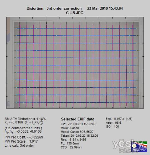 本次的畸变测试主要是针对本次评测所使用的EF-S 18-135mm f/3.5-5.6 IS套机头进行性能测试,包括下面的分辨率和色散测试也主要是针对EF-S 18-135mm f/3.5-5.6 IS套机头。