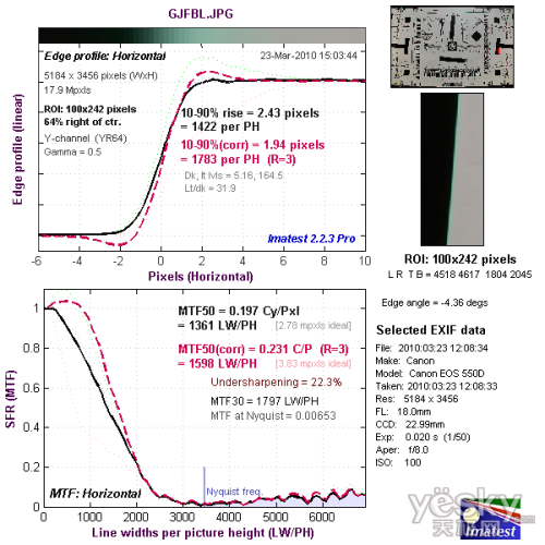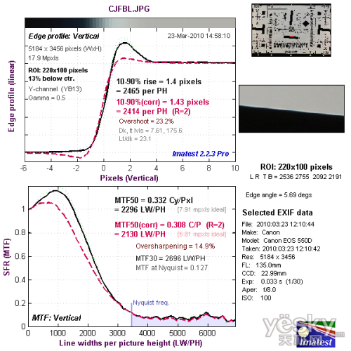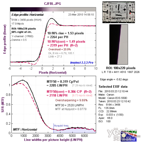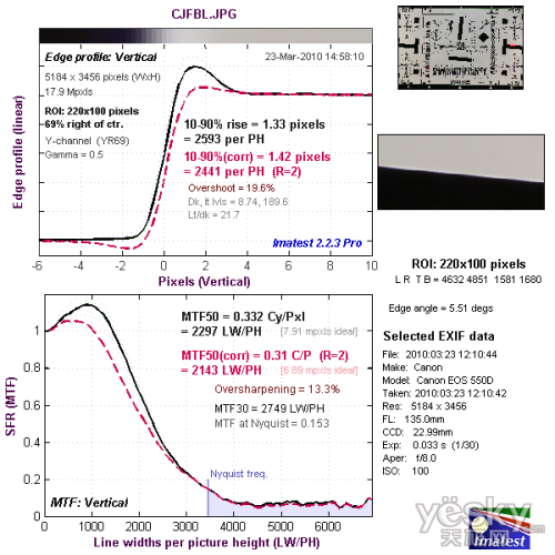 我们使用Imatest对本次评测所使用的EF-S 18-135mm f/3.5-5.6 IS套机头的分辨率与色散情况进行了测试,大家可以将测试所得的分辨率结果与上图标准进行比对,从而获得直观而明确的参考。