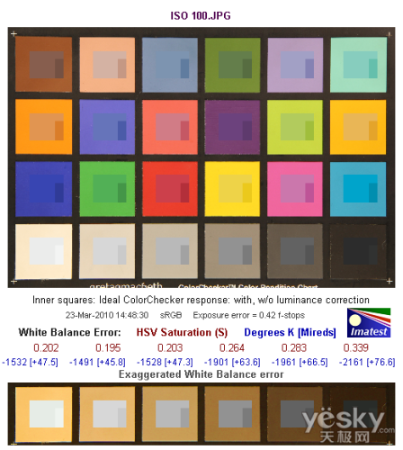 白平衡偏移方面,曝光值误差在0.42,曝光基本准确。白平衡方面,色温5500K的光照环境下,ISO 100时的偏移非常小,最高处为0.339,色温偏移数值为-2161,白平衡偏暖。