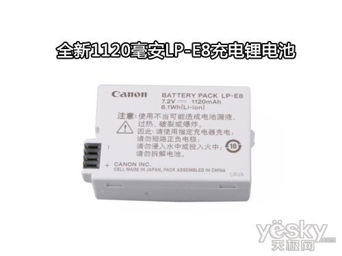 我们注意到,此次佳能EOS 550D全新配备了一块型号为LP-E8的1120毫安充电锂电池。充满电后的续航能力在500-600张左右,与之前的500D有略微的提升。