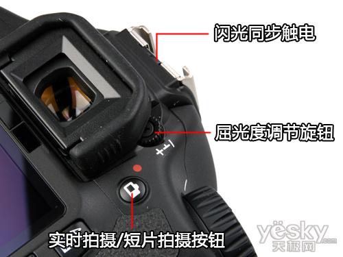 首先来看看左侧的按钮设计,闪光灯单弹出按钮、麦克风、镜头释放按钮、景深预览都与其前代500D完全相同。