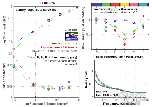 ISO 100的最高躁点值为0.2左右,属正常情况。从Row 3 noise:R,G,B,Y(Luminance)图表中可以看到,在蓝色上是以蓝色通道的噪点为最多,达到1.05左右。红色上是以蓝色通道的噪点为最多,达到1左右。绿色通道的噪点最高值出现在红色上,达到1左右。