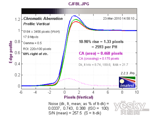 从长焦端边缘垂直方向色散测试结果来看,色散区域为0.2468像素,蓝色通道的色散高于其他三个通道。