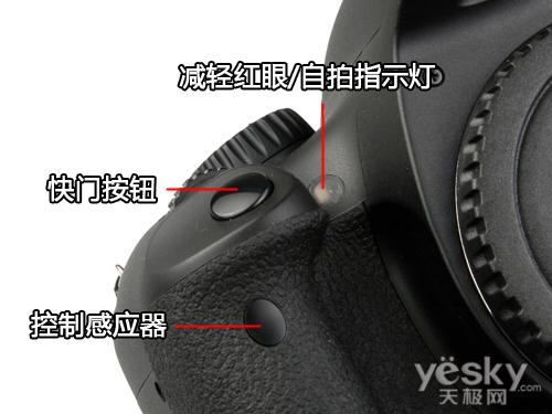 同样的在手柄部分,自拍指示灯、快门按钮、控制感应器一样不缺。还是继承了佳能入门单反系列的一贯设计风格,试按了几次快门,两段式设计手感明显操控十分顺手。