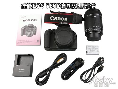 我们把佳能EOS 550D套机以及其附件全部罗列清点,包括:佳能EOS 550D,EF-S 18-135mm f3.5-5.6 IS镜头,充电锂电池,充电器,电源线,USB连接线,AV现,肩带,说明书等,配置相当的齐全。