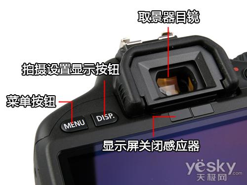 在屏幕的上方,依旧是一个取景器目镜的设计。目镜有一层黄绿色的镀膜,在目镜的左侧是一组菜单按钮以及拍摄设置显示按钮的设计。