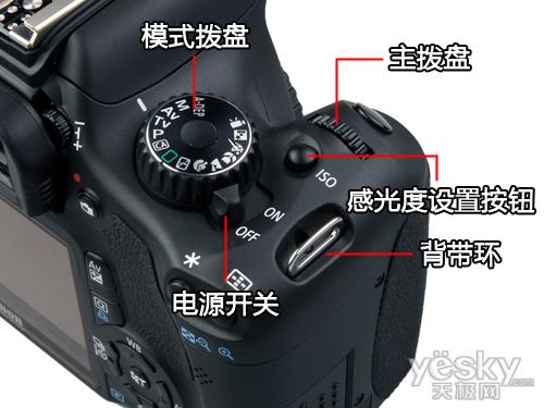 最后我们来看看EOS 550D肩部的设计。按键拨盘的设计与500D相同,只是原先500D银色的模式拨盘此次改为了黑色的设计,至于拨盘上的模式倒是与500D没有任何区别。
