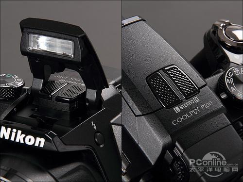 为了配合全高清视频短片拍摄,尼康P100在闪光灯附近设置了立体声拾音麦克风。