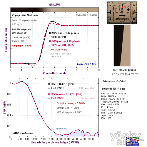 我们使用Imatest对富士HS11的镜头分辨率与色散情况进行了测试,大家可以将测试所得的分辨率结果与上图标准进行比对,从而获得直观而明确的参考。
