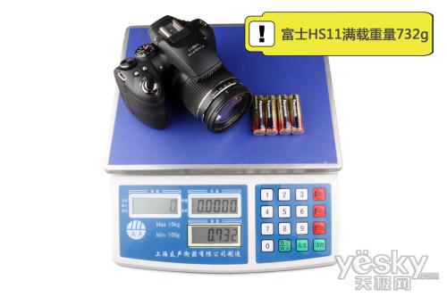 我们将富士HS11加上电池在电子秤上称重,重量为732克。重量虽然超出了便携的范畴,但相对单反动则几公斤的负重,携带富士HS11出行还是要轻松一些。