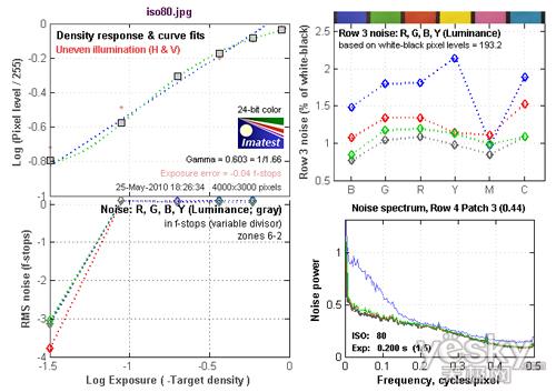 ISO 80的最高躁点值为0左右,情况非常好。从Row 3 noise:R,G,B,Y(Luminance)图表中可以看到,在蓝色上是以蓝色通道的噪点为最多,达到1.5左右。红色上是以蓝色通道的噪点为最多,达到1.8左右。绿色通道的噪点最高值亦出现在蓝色上,达到1.75左右。