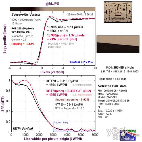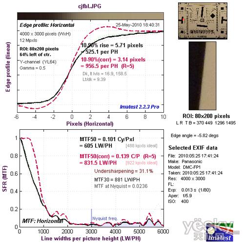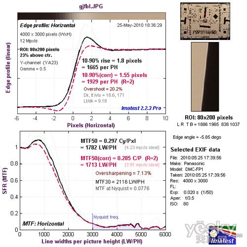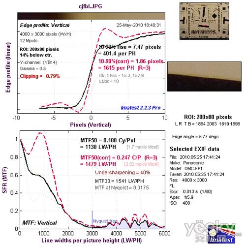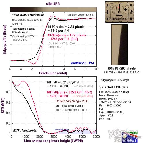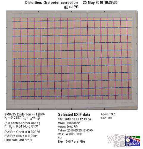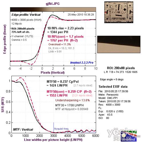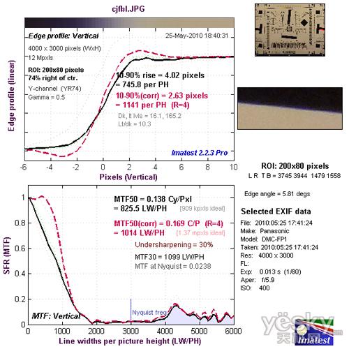 我们使用Imatest对松下FP1的镜头分辨率与色散情况进行了测试,大家可以将测试所得的分辨率结果与上图标准进行比对,从而获得直观而明确的参考。