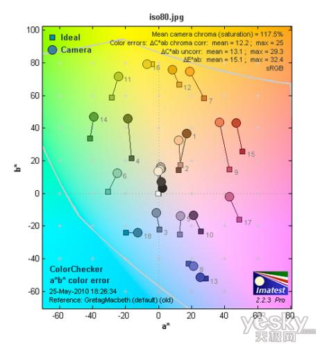 从ISO 80的色彩偏移的情况看,松下FP1的色彩饱和度为117.5%,最大偏移量为25。主要的色彩偏移区域在红色和绿色,黄色、蓝色区域的偏移相对比较好。这样的结果是照片对较红,如夕阳的表现会相当喜人。