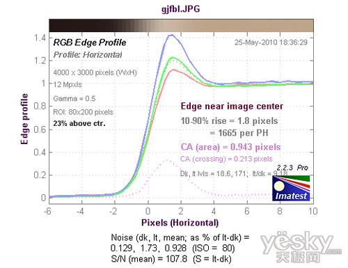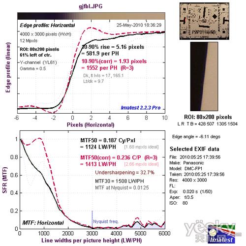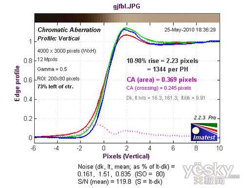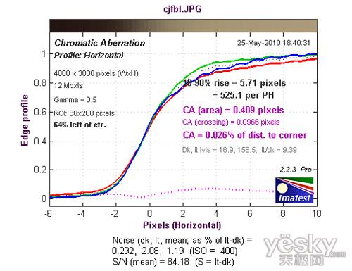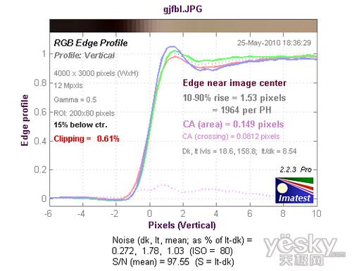 从边缘水平分辨率测试的结果看,分辨率达到了1413LW/PH,处于好的水平,机内进行了一定的锐化,出现了一定的驼峰现象。