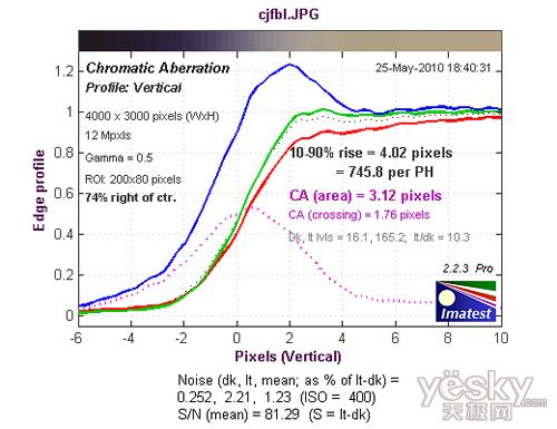 从长焦端边缘垂直方向色散测试结果来看,色散区域3.12像素,蓝色通道的色散高于其它三个通道。