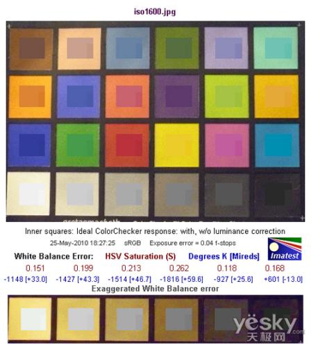 白平衡偏移方面,曝光值误差在0.04,白平衡轻微偏移,比较准确。白平衡方面,色温5500K的光照环境下,ISO 1600时的偏移比较小,最高处为0.262,色温偏移数值为-1816,白平衡偏暖。