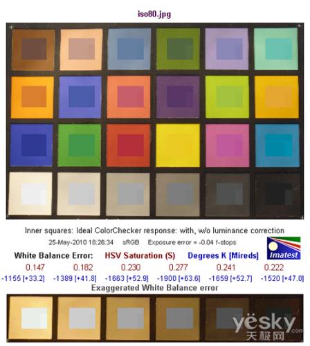 白平衡偏移方面,曝光值误差在-0.04,白平衡没有偏移,非常准确。白平衡方面,色温5500K的光照环境下,ISO 80时的偏移非常好,最高处为0.277,色温偏移数值为-1900,白平衡偏暖。