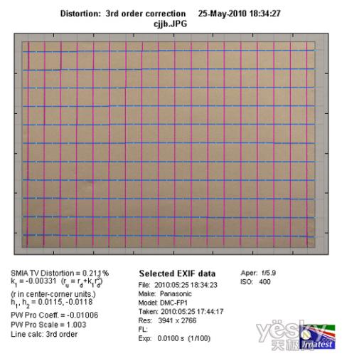 松下FP1广角端的数值为-1.65%,桶型畸变程度并不明显。而长焦端的枕型畸变数值为0.211%,枕型畸变程度也不是那么明显。通过这次测试,我们可以看到松下FP1所使用的镜头的光学性能变现的令人满意,完全可以满足我们普通的日常拍摄需求。