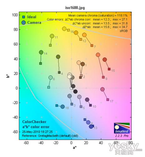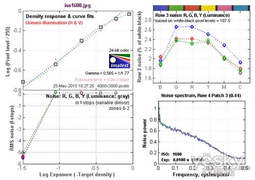ISO 1600的最高躁点值为0.25左右,情况比十分出色。从Row 3 noise:R,G,B,Y(Luminance)图表中可以看到,在蓝色上是以红色通道的噪点为最多,达到2.05左右。红色上是以蓝色通道的噪点为最多,达到2.6左右。绿色通道的噪点最高值出现在蓝色上,达到2.6左右。