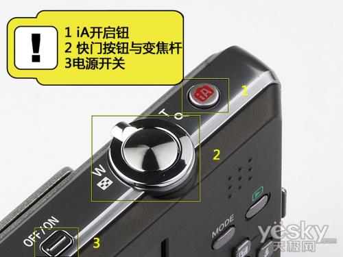 在机身的顶部,银色的金属装饰条加银色的功能按钮让人感到时尚与动感。从左到右分别是电源开关、变焦杆、快门按钮以及IA智能模式按钮。