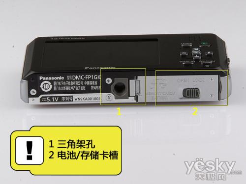来到松下FP1的底部,这里与其他传统消费相机设计一样。分别是一个三角架安装孔以及一个电池/存储卡仓。