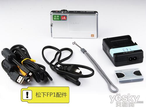 我们将松下FP1数码相机以及其所有附件进行罗列,有:USB传输线、AV线、充电器、电源线以及电池罩等,可谓是相当的齐全。