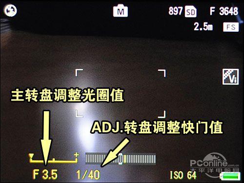 而我们以全手动的M档拍摄模式为例,在全动手曝光的时候,我们需要调整的光圈和快门就靠这两个转盘操作,前面的主转盘调整光圈值,背面的ADJ.转盘则可以调整快门速度。