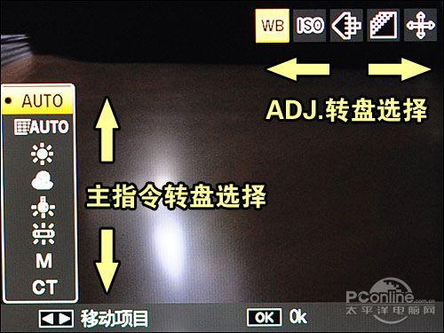 在调整拍摄参数的界面中,只要拨动ADJ.转盘,便可以在白平衡、ISO感光度、画质等选项中切换,而如果想调整选项中的值,就可以使用机身前面的主指令转盘来调整,例如上面的图中希望把白平衡切换为手动白平衡,那么转动主转盘把选择项移动到“M”的位置就可以了。