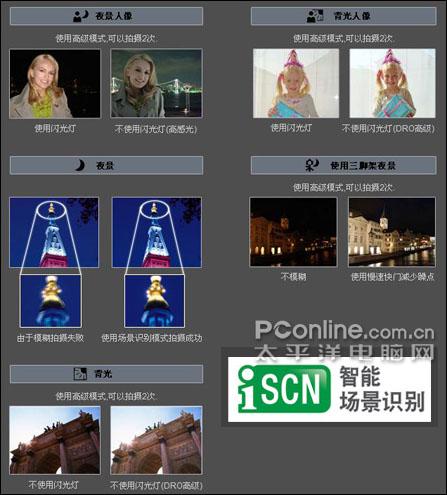 智能场景识别分两种不同模式,即高级和自动。高级模式拍摄两次,一次采用标准自动设置,另一次采用优化设置,减少因在背光和黑暗环境中拍摄时照片不满意的可能。自动模式仅拍摄一次,任意确定适合的设置。