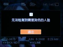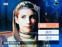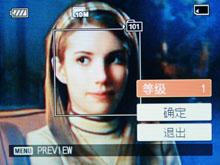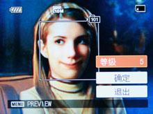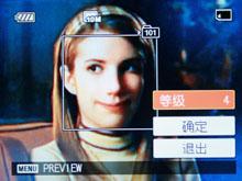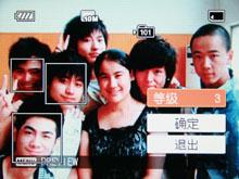 微笑化效果是W170中新增的,该效果是为面部增加笑容的照片修饰功能,笑容级别可在1到5的范围内调节,当然,无论选择级别多少也不会出现苦脸。不过通过多种场合下的测试可以发现,微笑化效果的对象是相机自动识别的,也并不是根据脸部识别功能拍照时的对焦人脸。一般容易识别的人脸微笑化的效果也不错,当无法检测到需要润色的人脸时便会发出提示。多人的场合下相机会把它识别到的人脸同时微笑化,对焦时是以中间女士为识别焦点,但是微笑化的识别并不包括她,笔者估计相机已经识别到她在笑了。