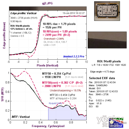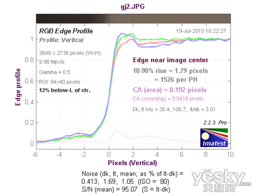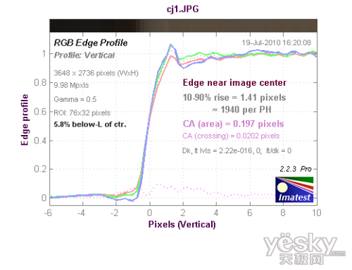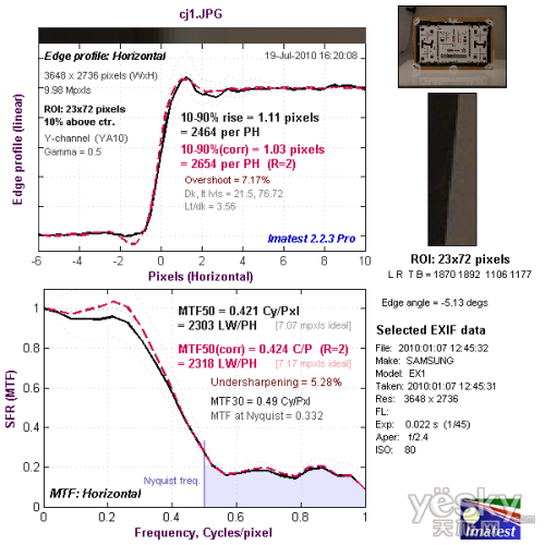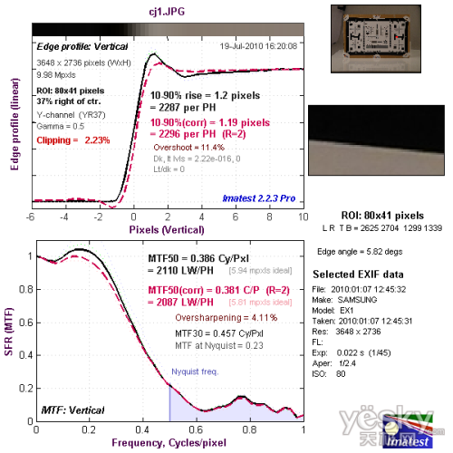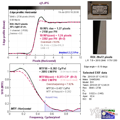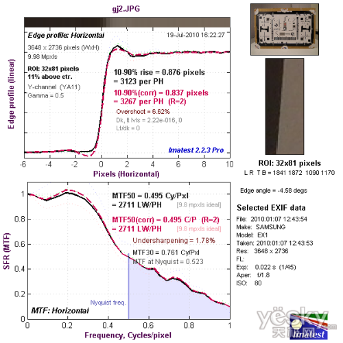 接下来的4页,我们使用Imatest对三星EX1的镜头分辨率与色散情况进行了测试,大家可以将测试所得的分辨率结果与上图标准进行比对,从而获得直观而明确的参考。