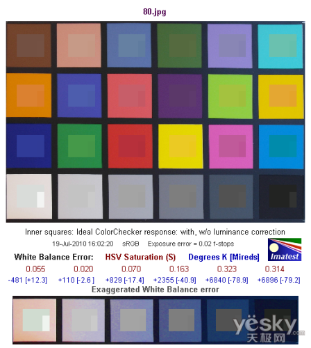 白平衡偏移方面,曝光值误差在0.02,曝光值可以说没有偏移,非常准确。白平衡方面,色温5500K的光照环境下,ISO 80时的偏移非常好,最高处为0.323,色温偏移数值为6840,白平衡偏冷。