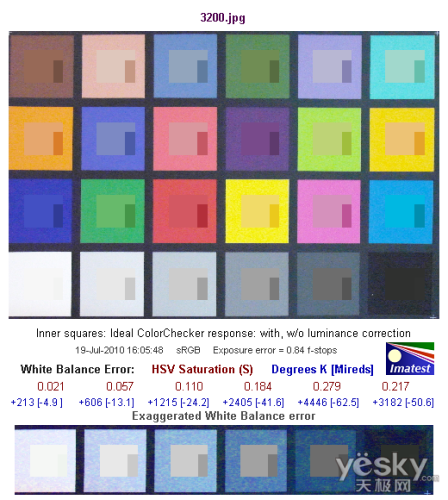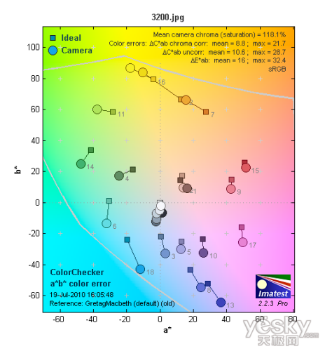 我们再次使用24色标准色板作为测试的基准平台,并使用Imatest软件进行数据的量化分析,对三星EX1在ISO3200情况下的色彩表现进行检测。