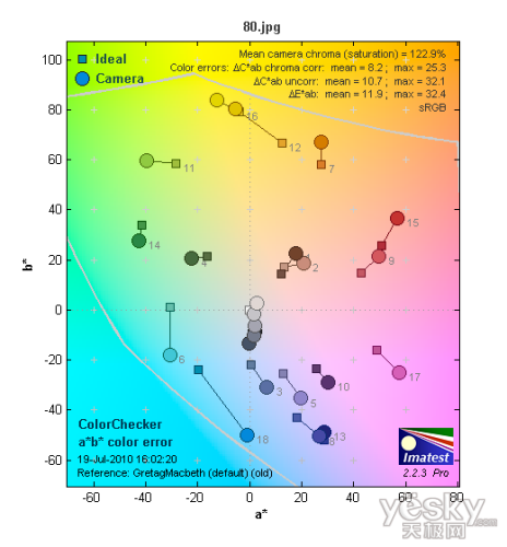 我们使用24色标准色板作为测试的基准平台,并使用Imatest软件进行数据的量化分析,对三星EX1在ISO100情况下的色彩表现进行检测。