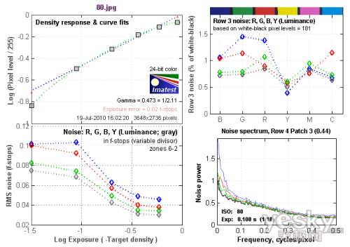 ISO 80的最高躁点值为0.1左右,情况非常好。从Row 3 noise:R,G,B,Y(Luminance)图表中可以看到,蓝色上以蓝色通道和红色通道的噪点差不多,达到1.0左右。红色上是以蓝色通道的噪点为最多达到1.4左右。绿色通道的噪点最高值出现在蓝色上,达1.5左右。