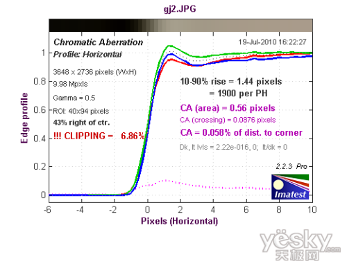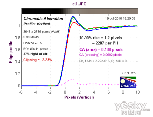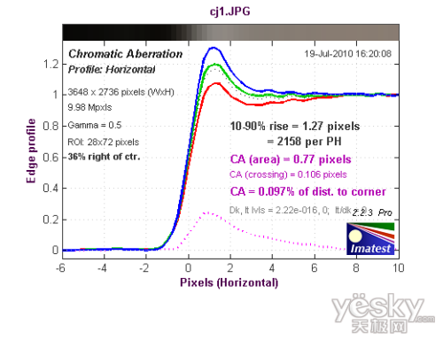 从长焦端边缘水平方向色散测试结果来看,色散区域为0.138像素,蓝色通道的色散轻微高于其他通道。