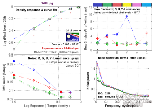 ISO 3200的最高躁点值为0.27左右,噪点有增加的趋势。从Row 3 noise:R,G,B,Y(Luminance)图表中可以看到,在蓝色上红色通道的噪点最多,达到3.0左右。红色上是以蓝色通道的噪点为最多,达到4.1左右。绿色通道的噪点最高值出现在蓝色上,同样达到4.1左右。